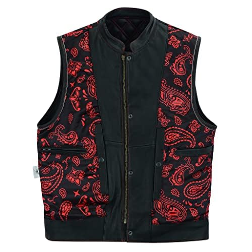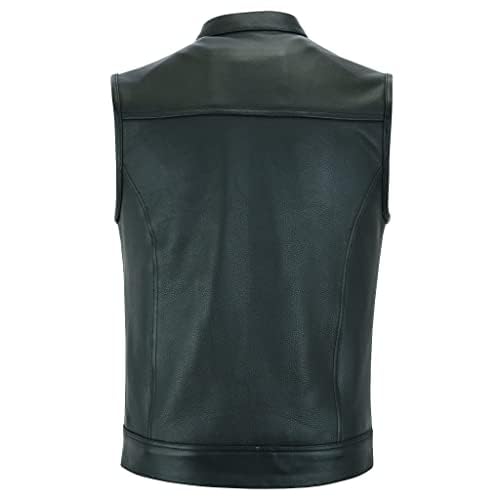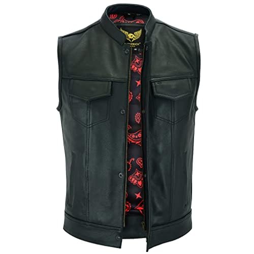 Met onze collectie van trendy, onderscheidende vesten kun je je outfit verfijnen en stijlvol verfraaien. Dit prachtige “Groove Club”-leren vest voor heren beschikt over een paisley satijnen voering en is op de voor- en achterkant van het vest buitengewoon goed genaaid. Dubbele draadnaden op de hoofdnaden geven dit leren vest een klassieke, tijdloze look. De buitenkant van ons leren bikervest heeft een echte messing ritssluiting en verborgen metalen drukknopen, waardoor het het het beroemdste kledingstuk in westernstijl maakt. De unieke ritssluiting aan de voorkant van dit vest is niet alleen een designkenmerken, maar maakt het ook mogelijk om de pasvorm naar wens aan te passen. Bovendien heeft ons zwarte leren vest voor heren twee borstzakken, twee handwarmerzakken met klep die zich aanvullen en ideaal zijn om al je gadgets op te bergen, en vier binnenzakken die je benadrukt. Dit hoogwaardige leren bikervest is niet alleen de ideale kleding voor een fietstocht, maar begeleidt je bij elke denkbare gelegenheid.