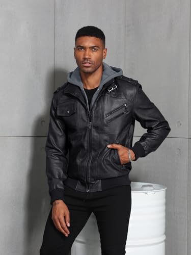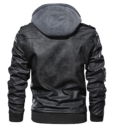 Uusollecy Leren herenjas met afneembare capuchon, leren jas met capuchon, zwart, XL